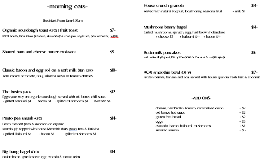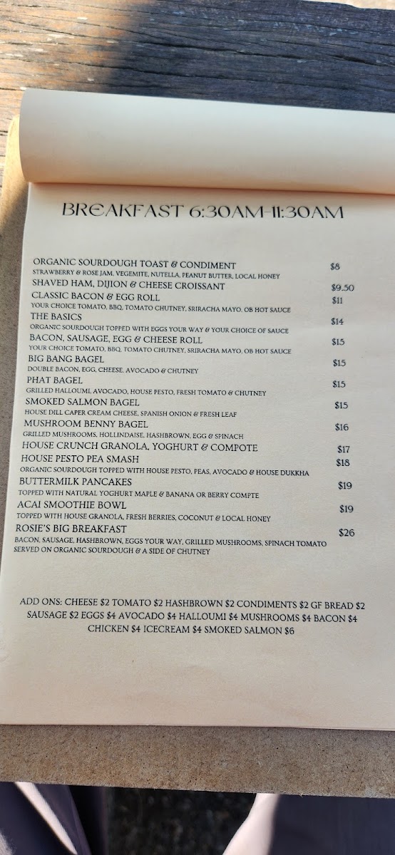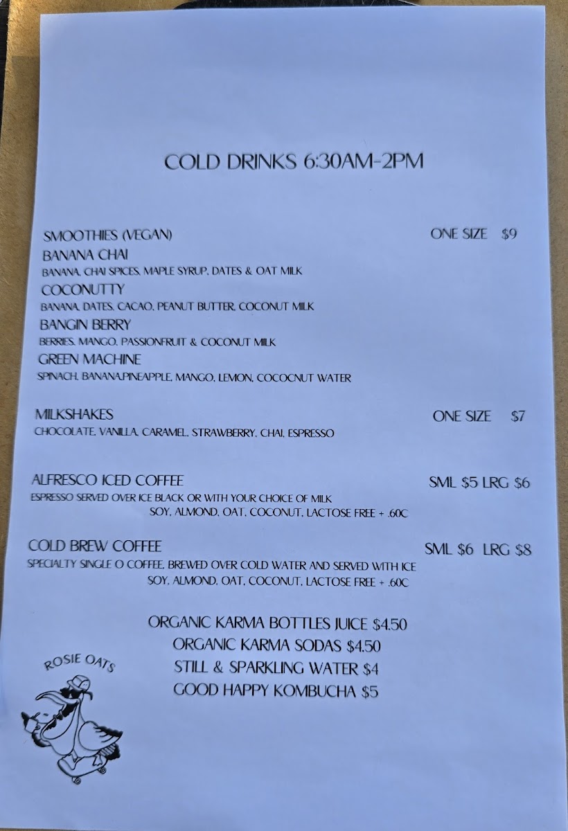 The menu at Rosie Oats is designed to cater to various dining occasions, including breakfast, lunch, and casual coffee breaks. It offers a selection of both food and beverages, structured into distinct categories for ease of choice.