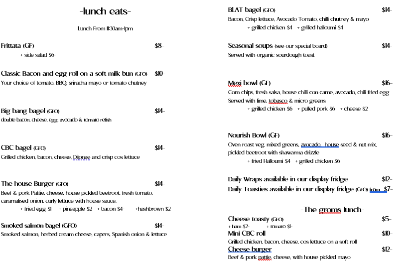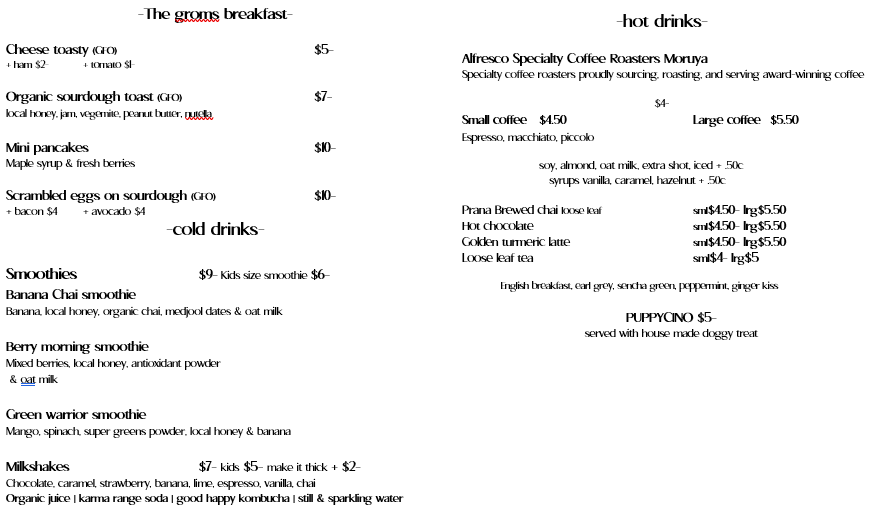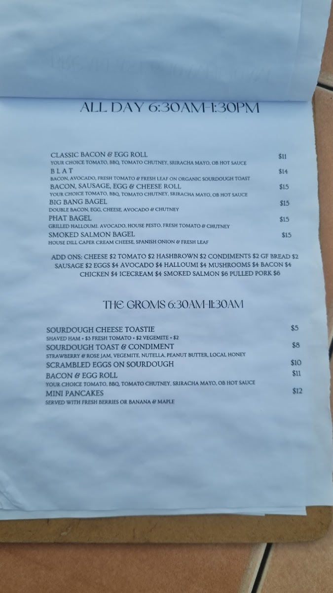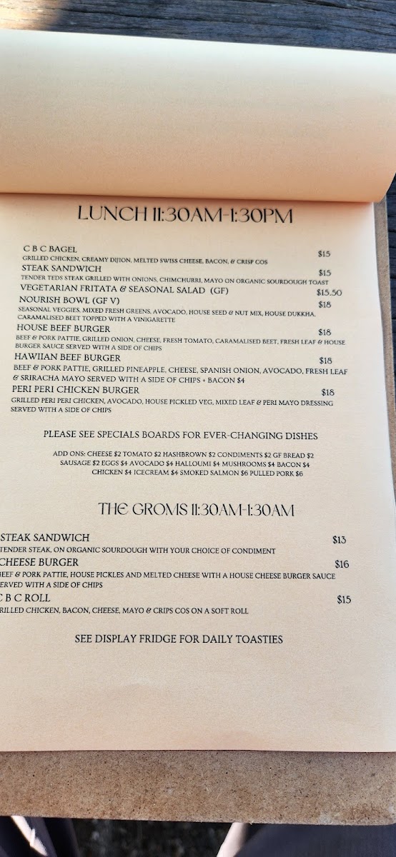 The Groms Lunch section offers smaller-sized meals geared towards younger diners, featuring items like cheese toasty, mini CBC roll, and a cheese burger.